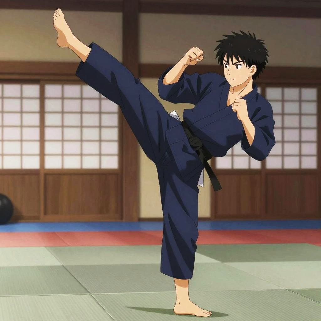 Realistic photo.a swift martial artist, wearing a traditional gi, engaging in executing a high kick, in a serene dojo, depicted in the energetic and character-driven anime style of Tetsuya Chiba. realistic photo