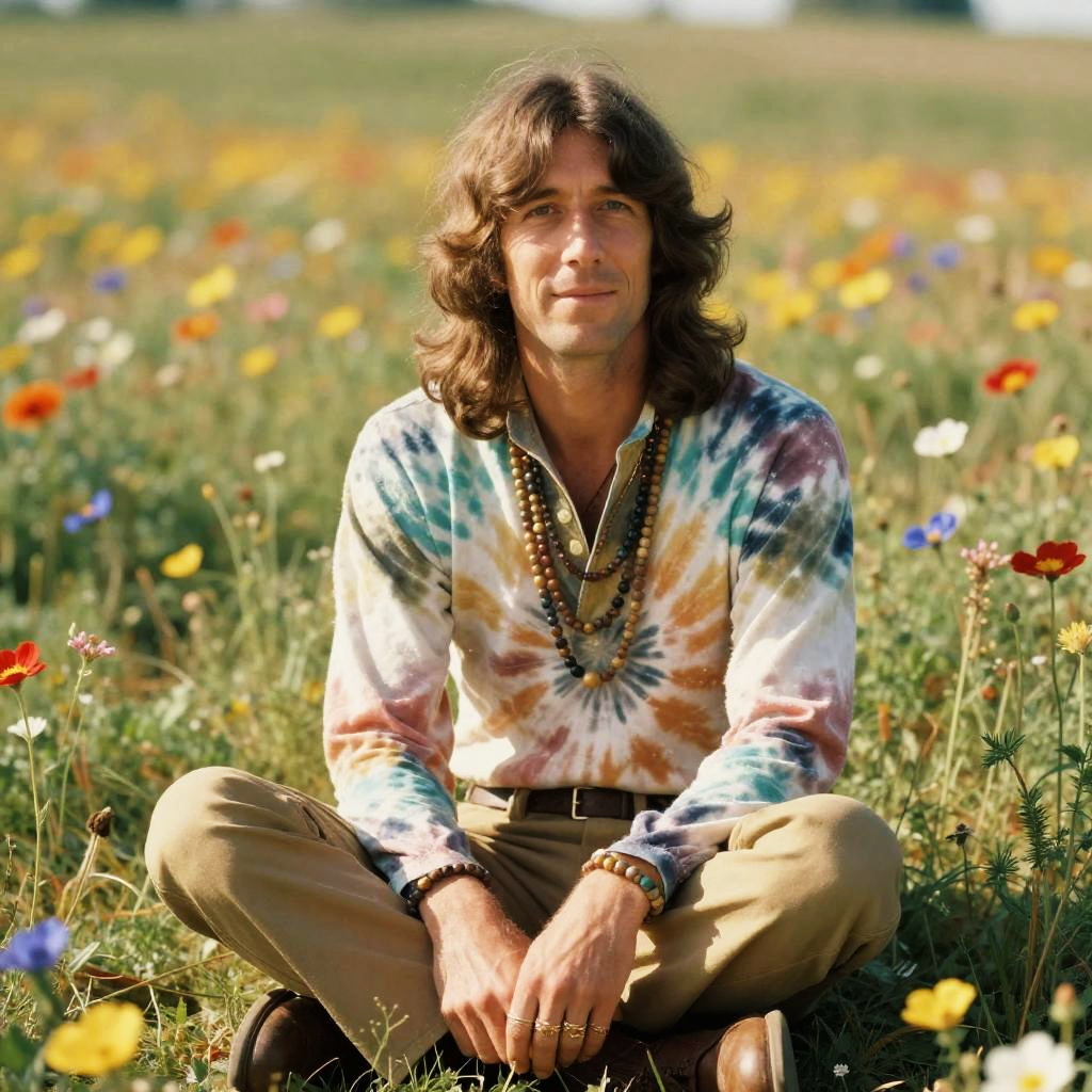 Photograph of a young man with wavy brown hair, seated cross-legged in a vibrant meadow filled with colorful wildflowers. He wears a tie-dye shirt with blue, pink, and white patterns, beige pants, and a brown belt. A beaded necklace and gold watch adorn his wrist. His expression is calm, and he gazes slightly to the side. The background showcases a lush field with red, yellow, and purple flowers, and a blurred horizon of greenery and blue sky. The sunlight enhances the vivid colors and textures of the scene. The image exudes a 1970s retro vibe.