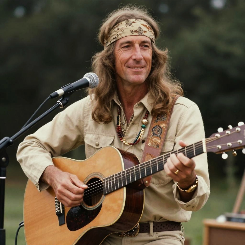 George Harrison hippie vibe, sitting cross-legged in a colorful field of wildflowers, wearing a tie-dye shirt and beads, sunlit atmosphere, soft focus, 1960s counterculture aesthetic