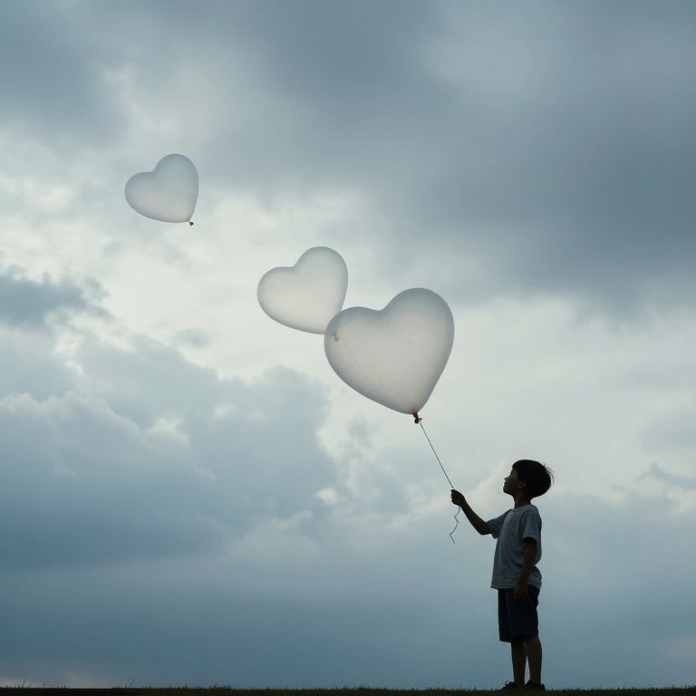 In this evocative image, a young boy stands in silhouette against a dramatic, cloudy sky, holding a large, heart-shaped balloon that appears to be made of a translucent material. The balloon is one of several similar shapes floating in the air, creating a sense of depth and movement. The boy's figure is positioned to the right, with the balloons slightly to his left, creating a dynamic composition. The overall color palette is muted, with shades of blue and gray dominating the scene, enhancing the melancholic and contemplative mood. The texture of the balloons and the boy's clothing adds a tactile quality to the image, while the clouds in the background provide a sense of scale and atmosphere. The scene is reminiscent of a photograph by Dorothea Lange, capturing a moment of simple joy amidst a vast, open sky.