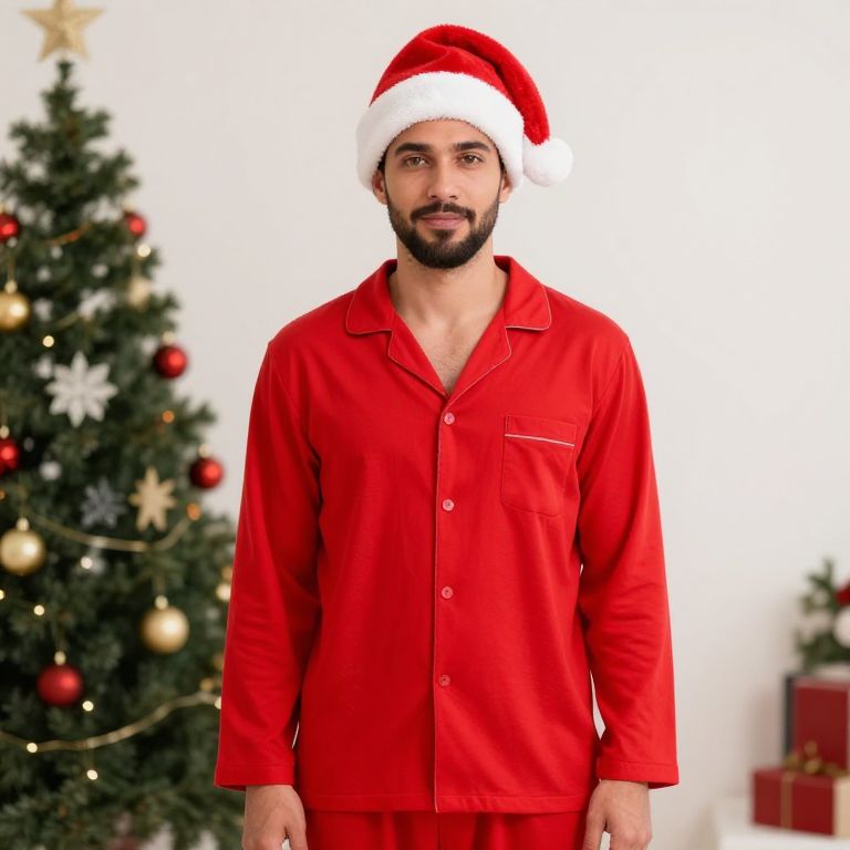 Male wearing a red Christmas pajama set with a Santa hat on his head.