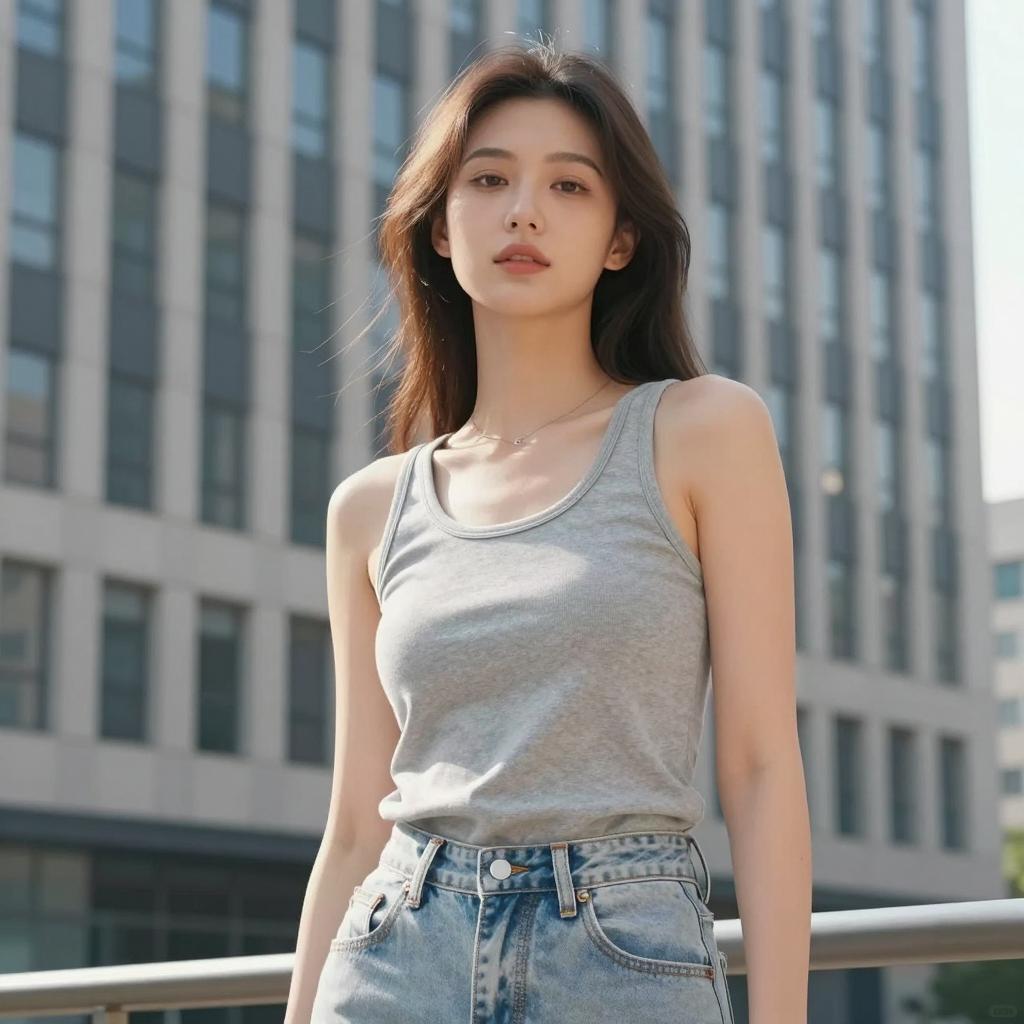 A young woman posing confidently outdoors in an urban setting, wearing a grey tank top and light denim shorts, soft natural sunlight illuminating her hair and skin, a tall modern building with repetitive windows in the background, casual modern style, cool tones with warm highlights, soft shadows