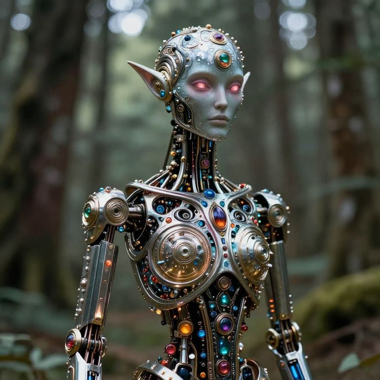 Psychedelia a robot built using elven technology, scrollwork, tiny jewels, high reflections, in a forest setting,