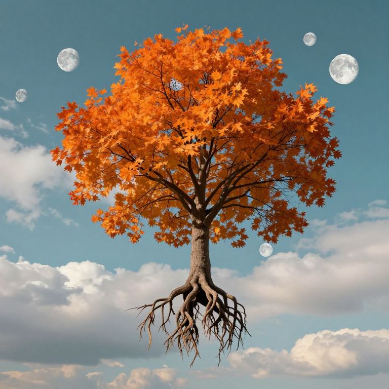 Photograph of a vibrant orange autumn tree with exposed roots, floating in a clear blue sky with scattered white clouds and floating moons.