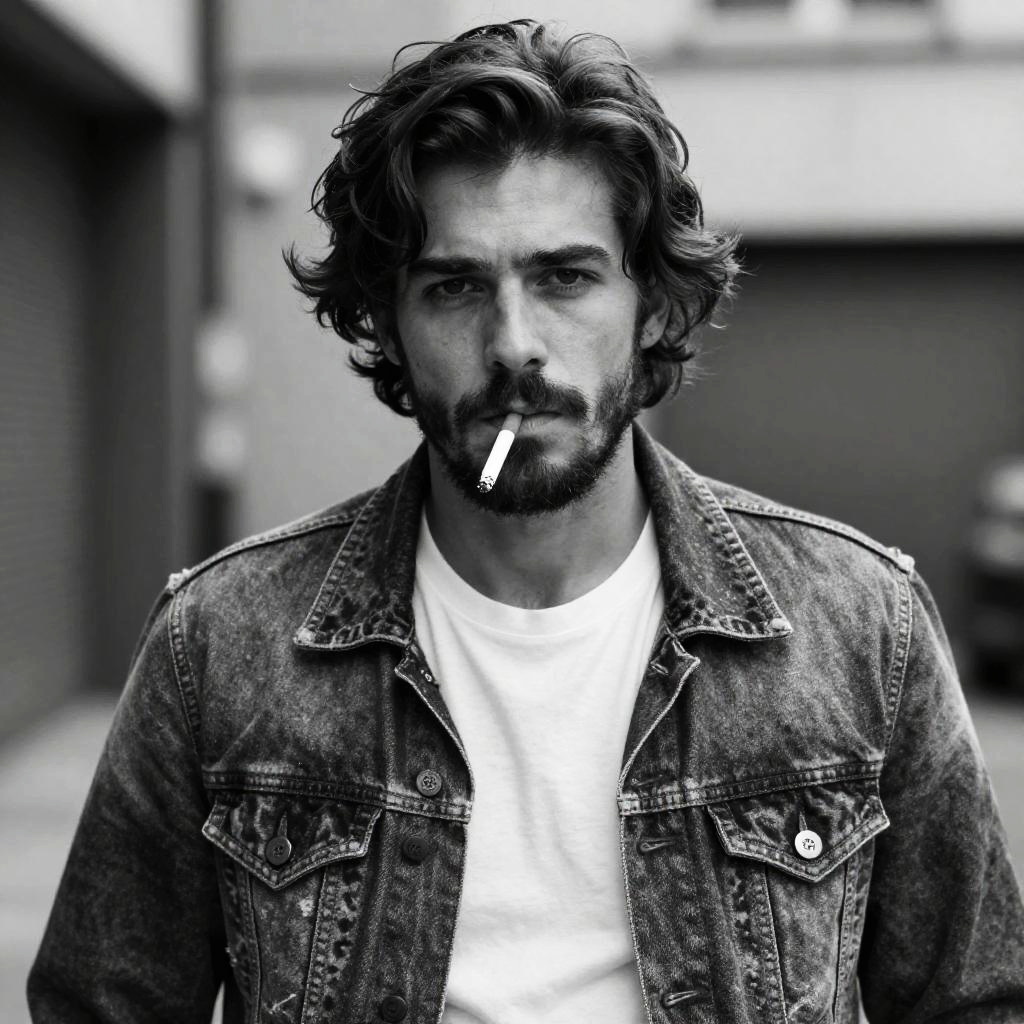 Black-and-white photograph of a rugged, handsome man with medium-length, wavy dark hair and a neatly trimmed beard. He's wearing a slightly worn denim jacket over a white T-shirt, with a cigarette hanging from his lips. The background is blurred, creating a stark contrast with his sharp, intense gaze. The image has a gritty, urban vibe.