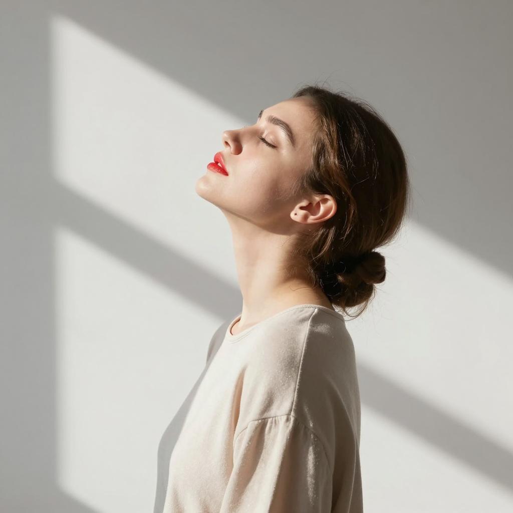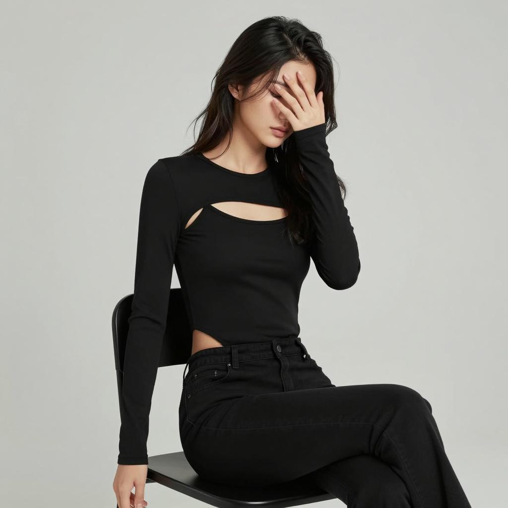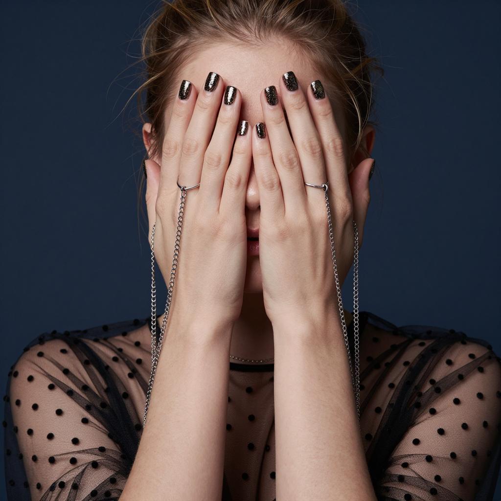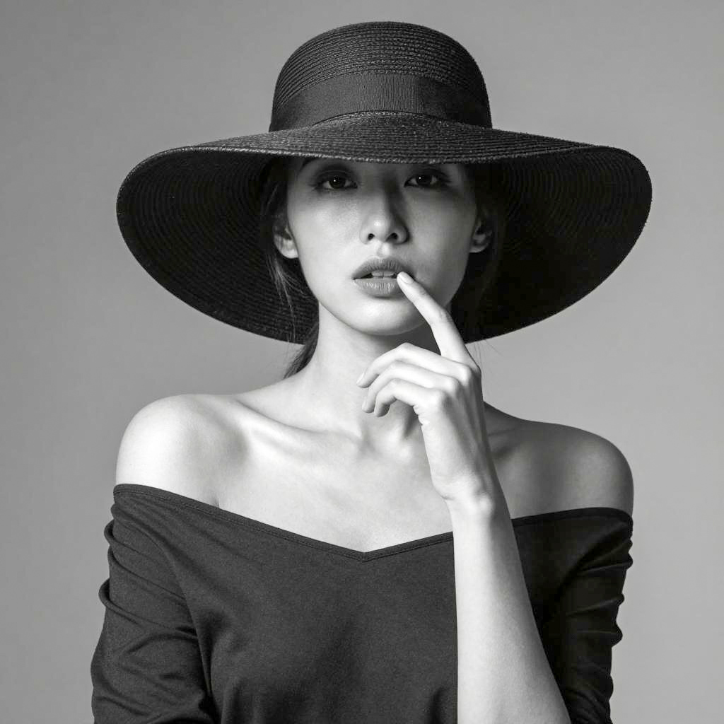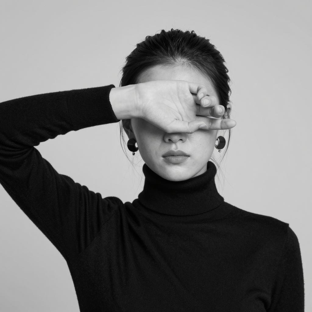 Black and white photo of a woman with fair skin and slicked-back dark hair. She wears a black, long-sleeve, turtleneck sweater and large, dangling earrings. Her right arm is raised, covering her eyes with her hand. Her left arm is bent, resting on her chin. She has a neutral expression. The background is plain and light gray.