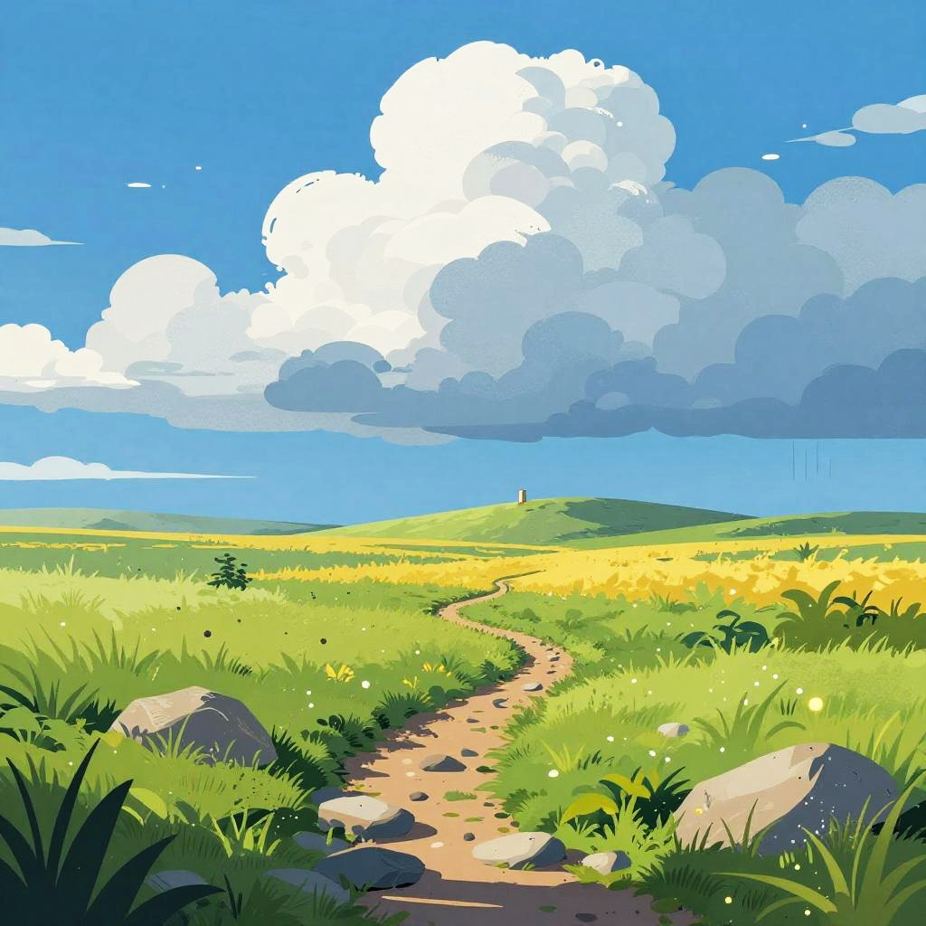 Minimalist vector art landscape set in wide grassland beneath stormy skies, bright blue sky with fluffy clouds. Oversized blue-tinted shapes frame a rocky path winding into a glowing golden field; a small landmark rests on a distant hill amid lush greenery. Saturated palette, crisp outlines, dithered textures, soft bloom, subtle fog, playful particles, storybook charm, dramatic and bold.