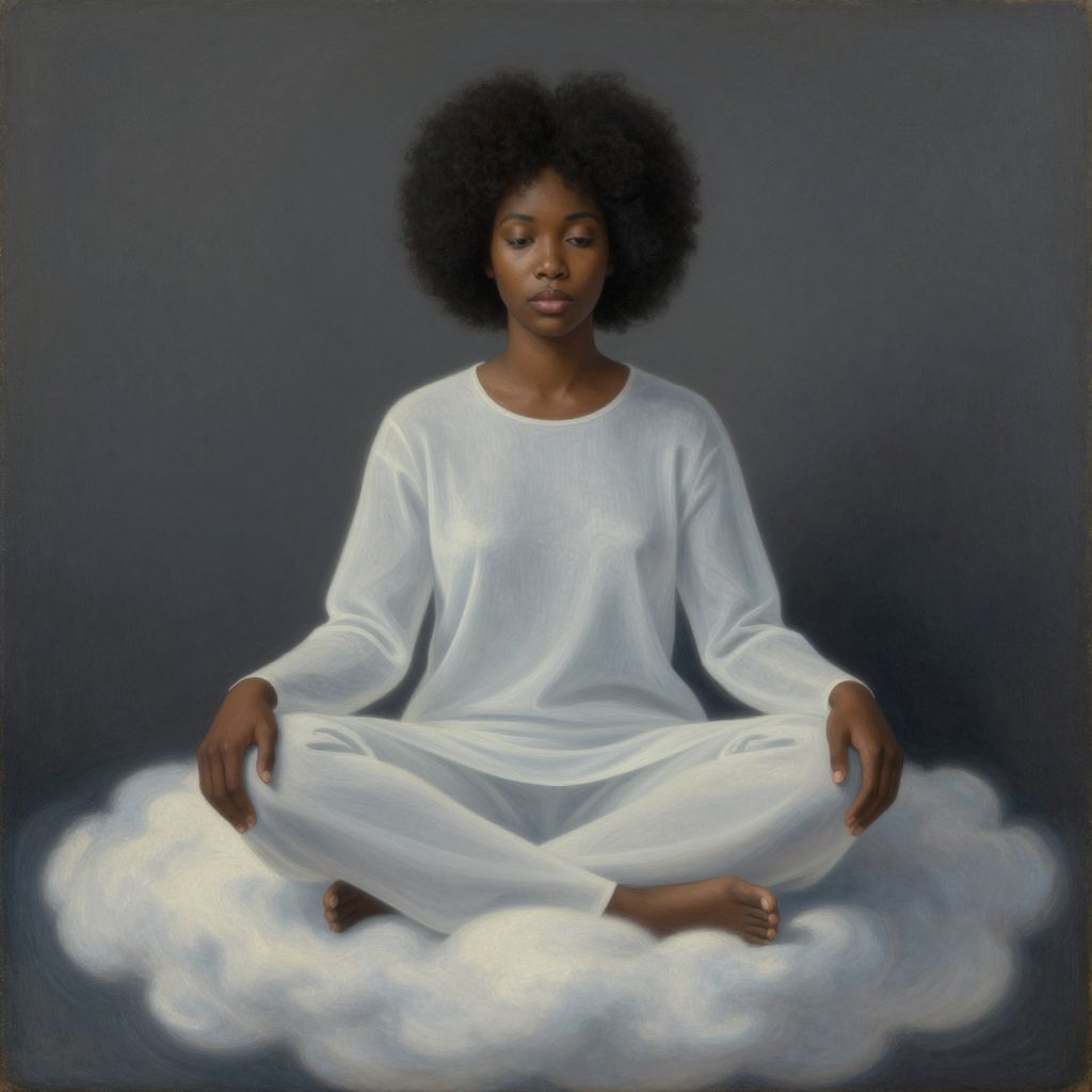 Photograph-realistic digital painting of a Black woman with a natural afro, sitting cross-legged on a cloud against a dark gray background. She wears a loose, long-sleeve white shirt and matching white pants, barefoot with toes visible. Her eyes are closed, and her expression is serene. The cloud beneath her is fluffy and white, contrasting with her dark skin and the gray background. The overall composition evokes a sense of calm and spiritual tranquility.