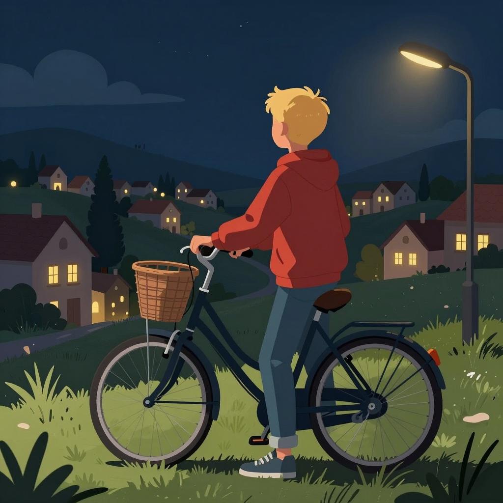 Nighttime illustration of a boy with short blonde hair, wearing a red hoodie and blue jeans, standing with his hand on a bicycle. The bicycle has a front basket. He faces a village with lit houses and a streetlamp. Dark blue sky with scattered clouds. Village lights create a distant glow. Grass in the foreground. The boy's back is to the viewer.