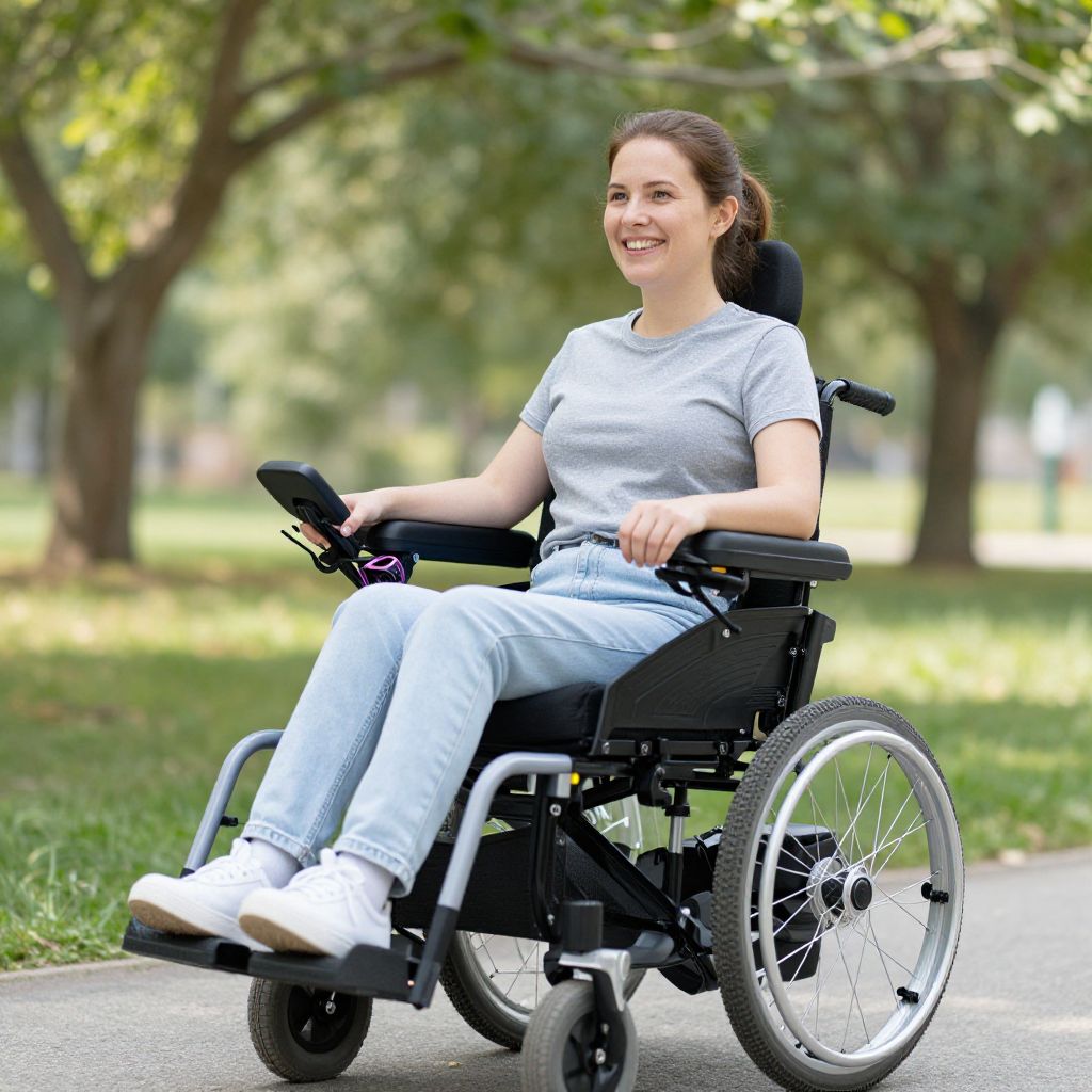 Woman smiling while seated in a motorized wheelchair, enjoying a sunny outdoor setting with green trees and grass in the background.