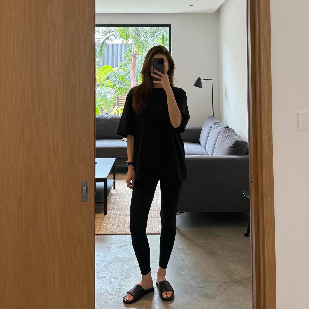 Woman with long brown hair, black oversized shirt, black leggings, black open-toe sandals, standing in doorway, holding phone, taking selfie. Background: modern living room with gray couch, large window, greenery outside. Concrete floor, wooden door, ured wall. Woman's face partially obscured by phone.