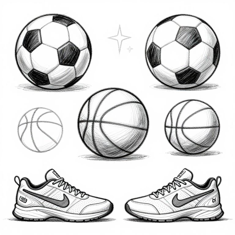 Dynamic sketch clipart portraying sports equipment in rough pencil style, featuring soccer balls, basketballs, and sneakers with energetic line work, ideal for youth sports promotions and team logos.