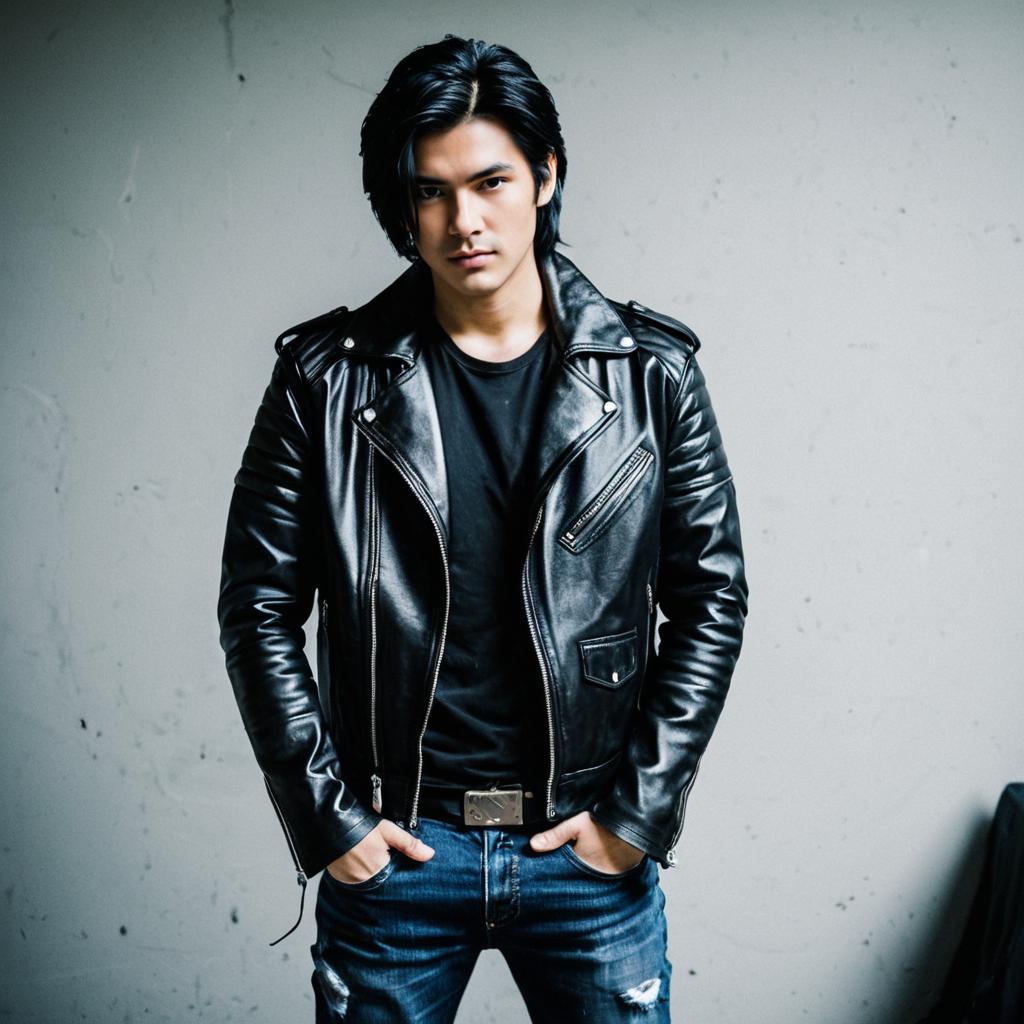 Sexy Loopz cosplay outfit, Detour Aaron Buer, black leather jacket slightly open, tight jeans, messy black hair, confident pose, medium shot