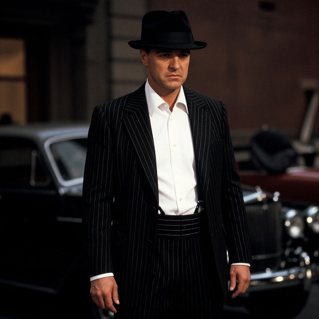 Godfather theme party dress featuring classic 1920s gangster elegance, sleek black and white pinstripe suit, crisp white shirt, suspenders, and a fedora hat, standing confidently against a backdrop of vintage cars and dim city streets, moody lighting with film grain effect.