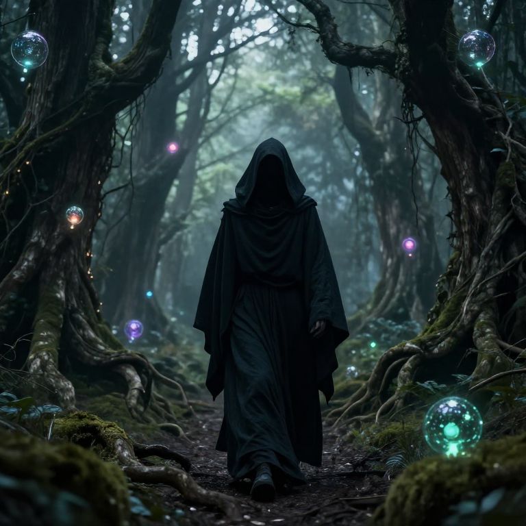 Mysterious hooded figure in dark cloak walks through enchanted forest, surrounded by glowing, colorful bubbles between twisted, moss-covered trees. Digital art.