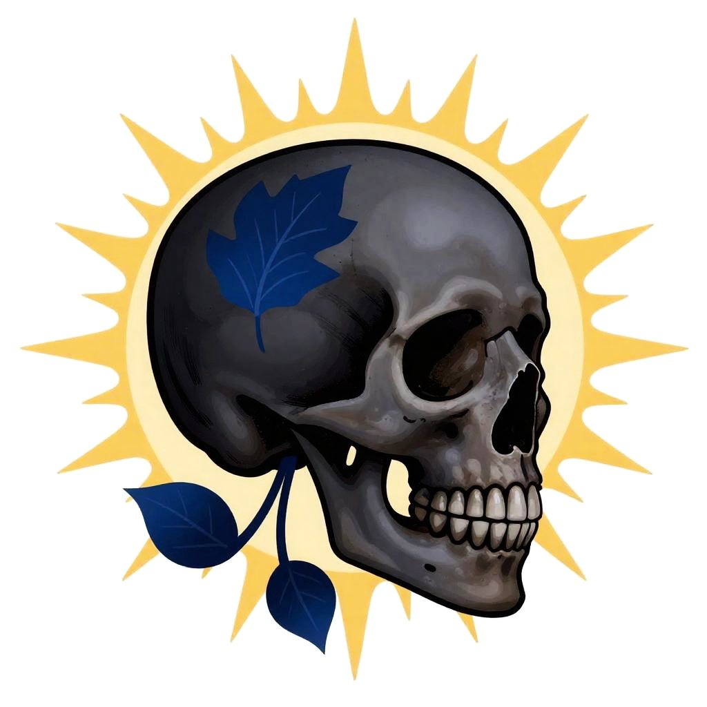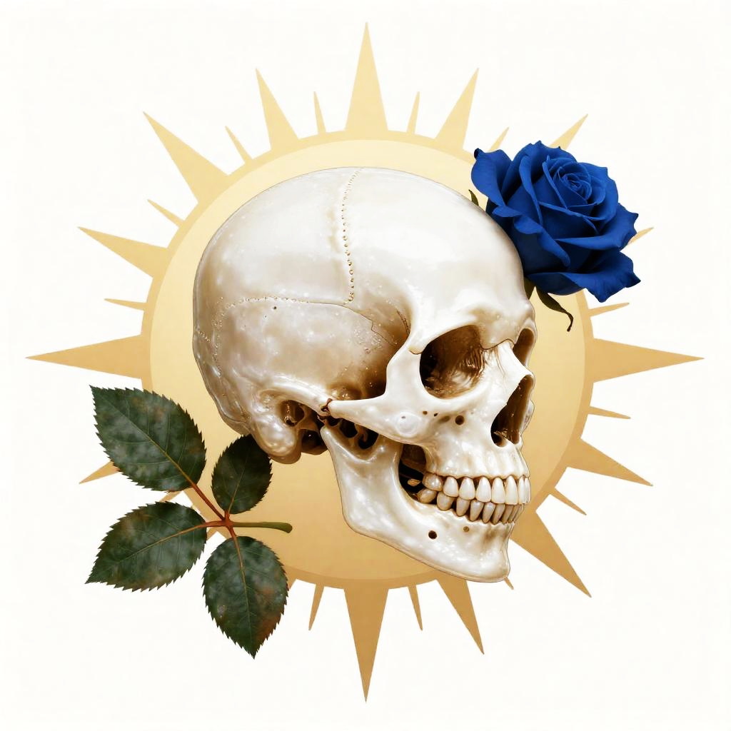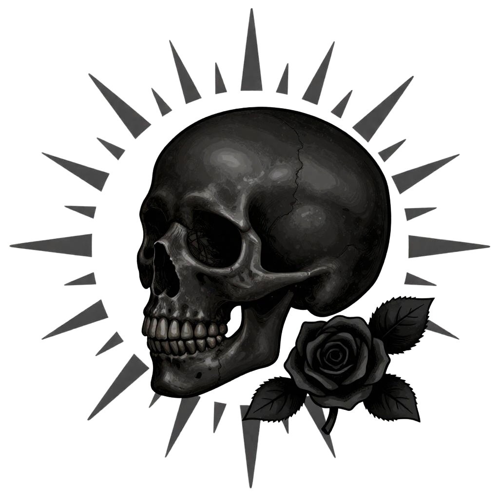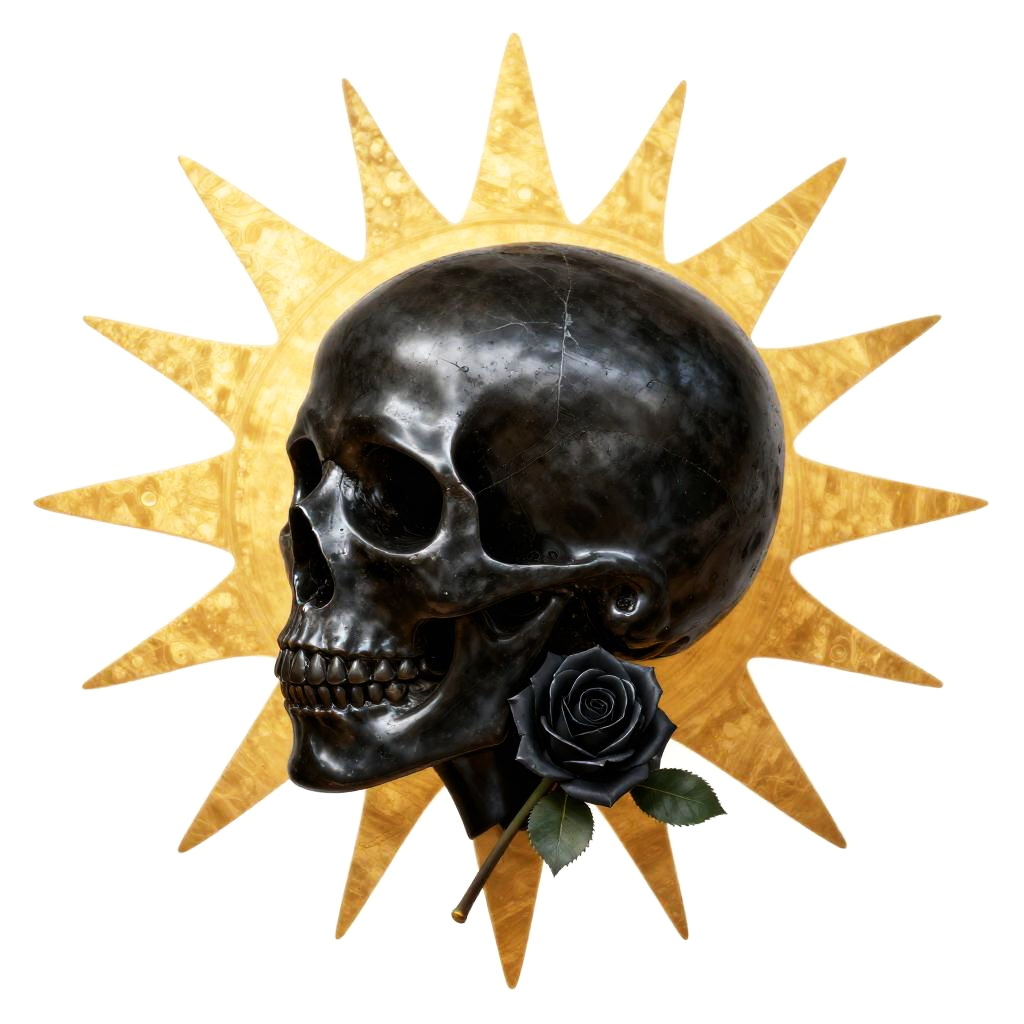 Skull, black skull, skull, no humans, sun, profile, from side, solo, male focus, leaf, rose, portrait, 1boy, traditional media, sunburst, black skull