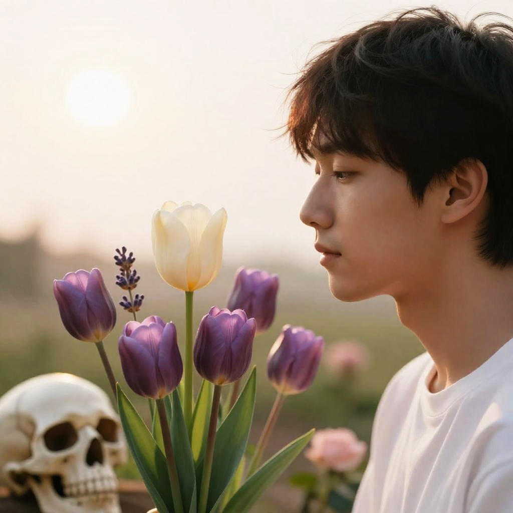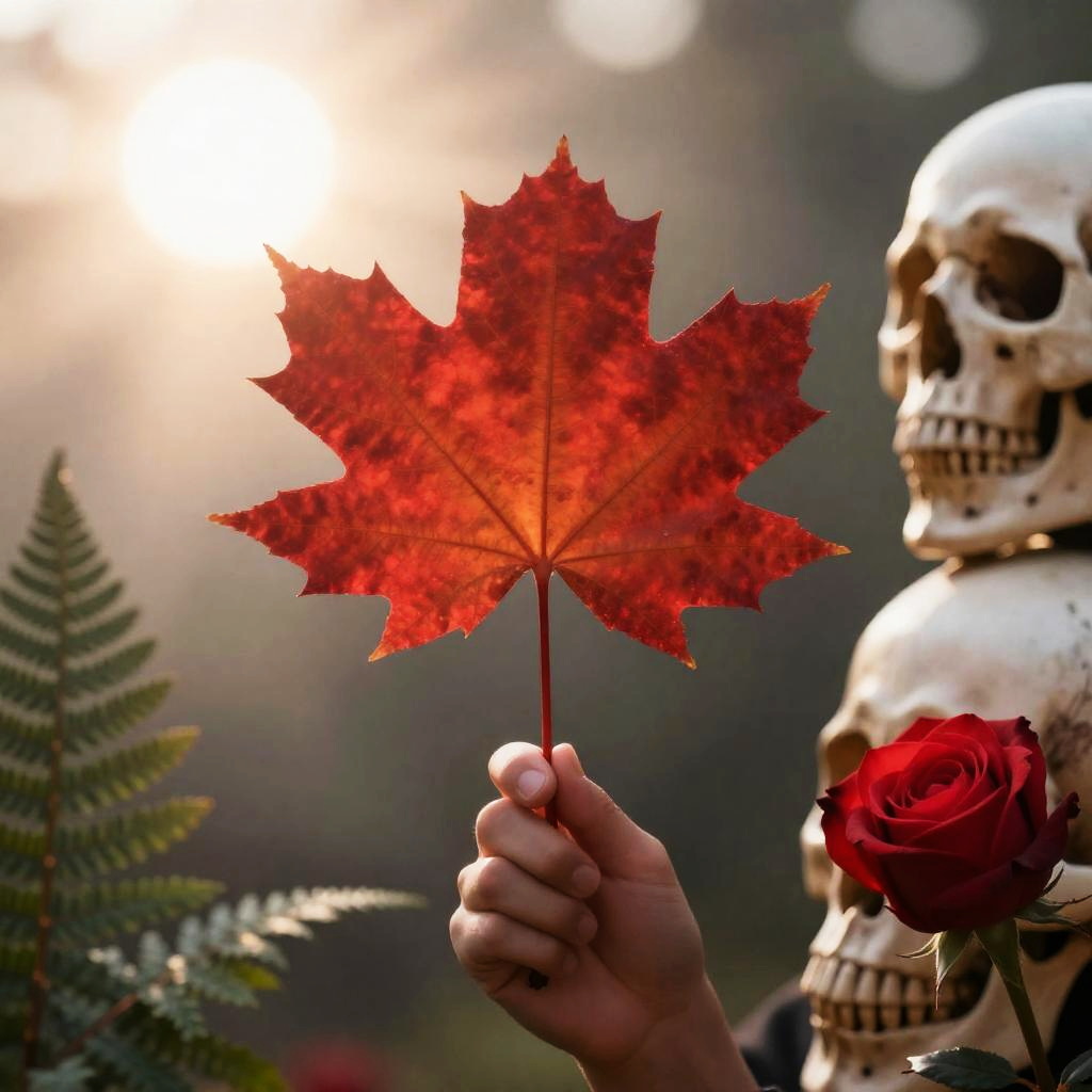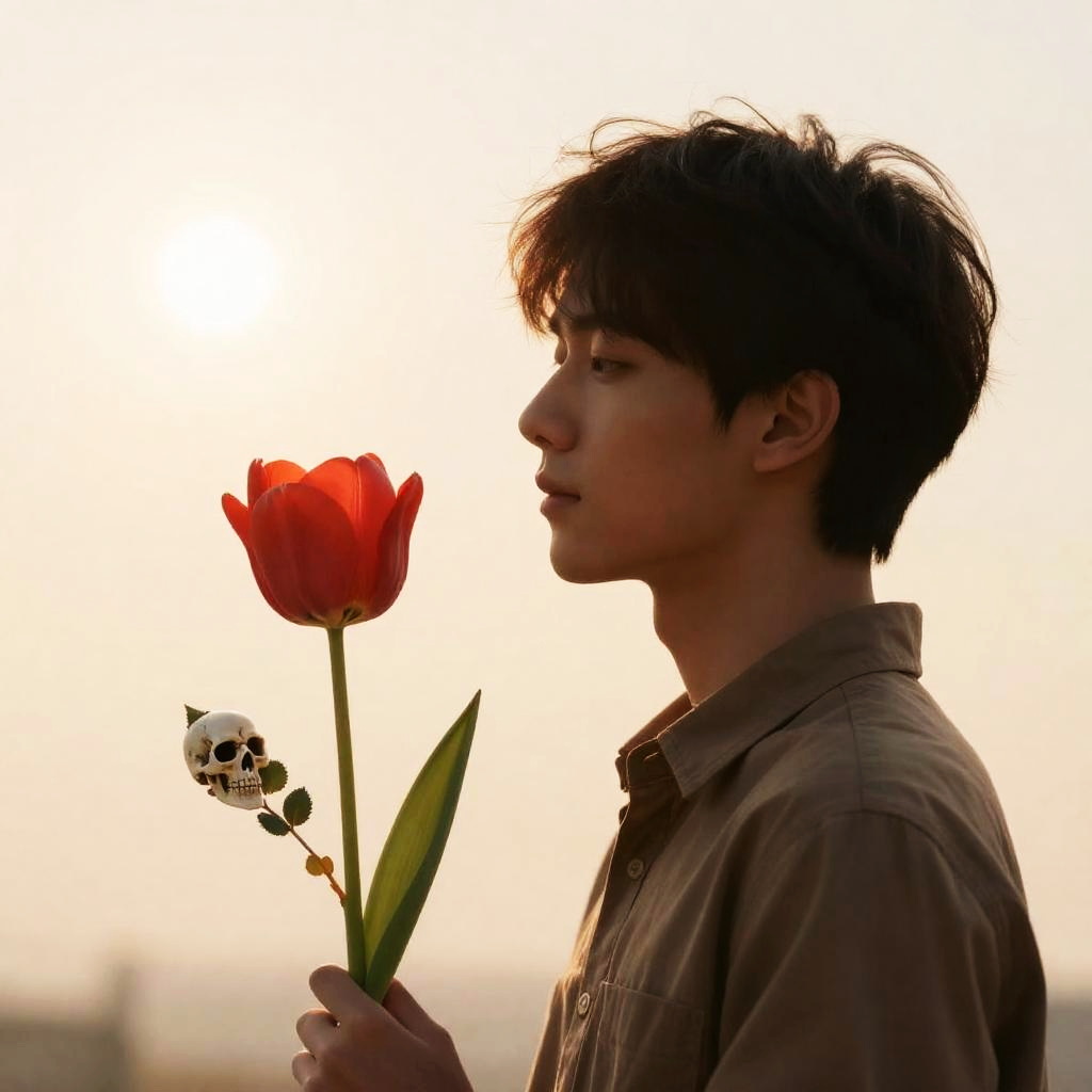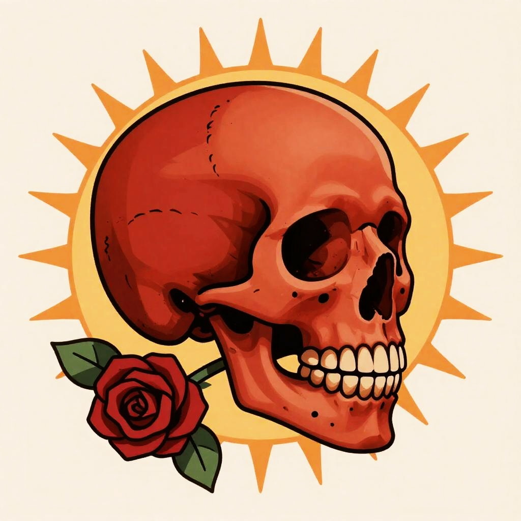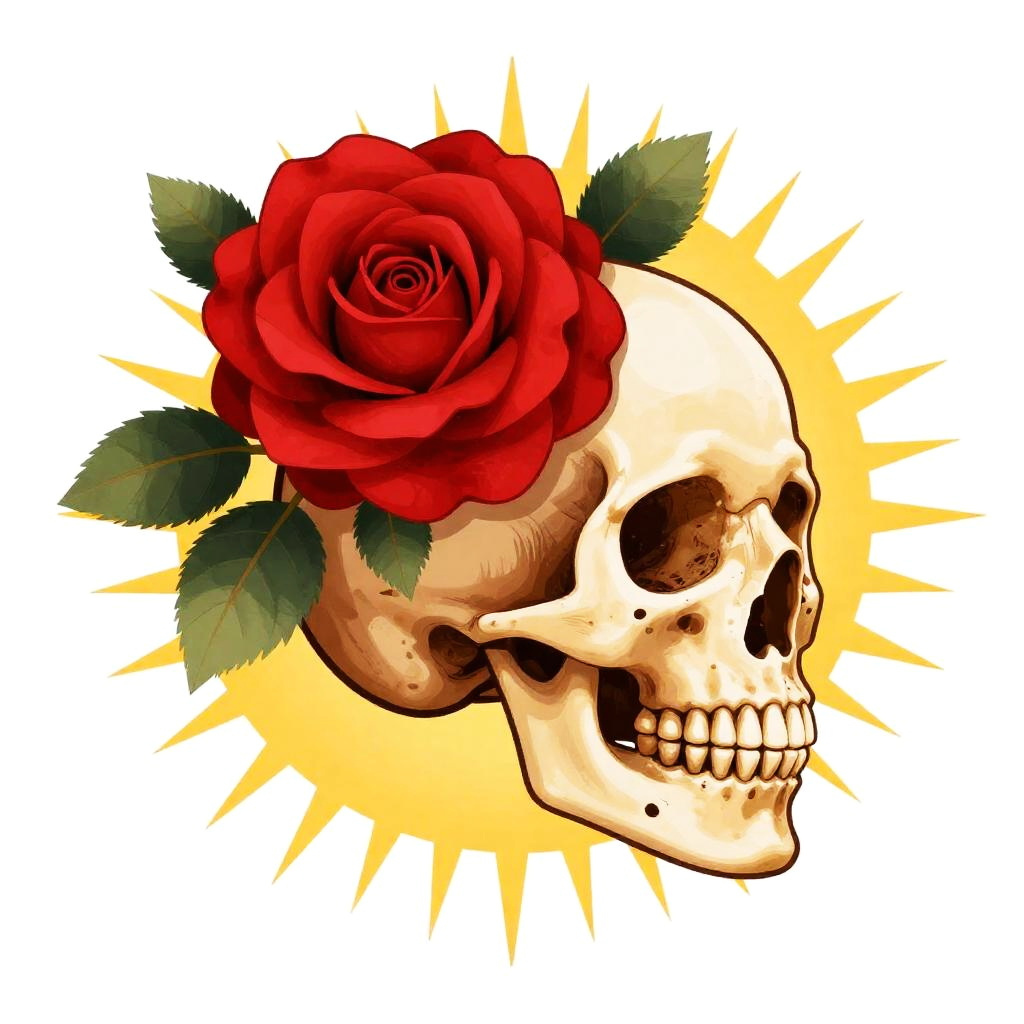 Skull, black skull, skull, no humans, sun, profile, from side, solo, male focus, leaf, rose, portrait, 1boy, traditional media, sunburst, black skull