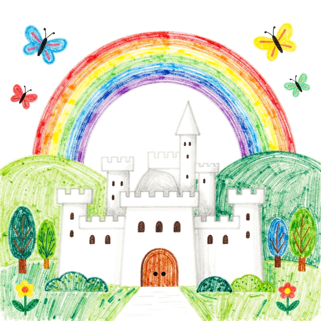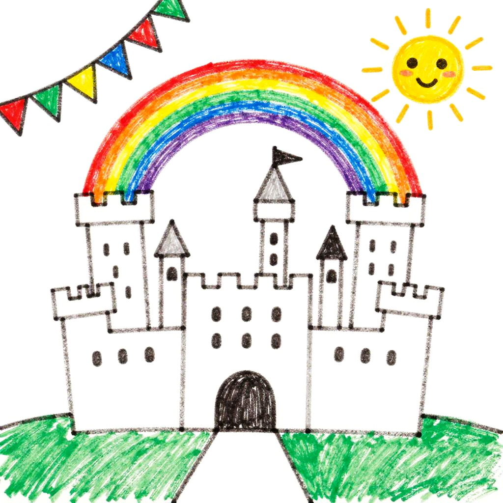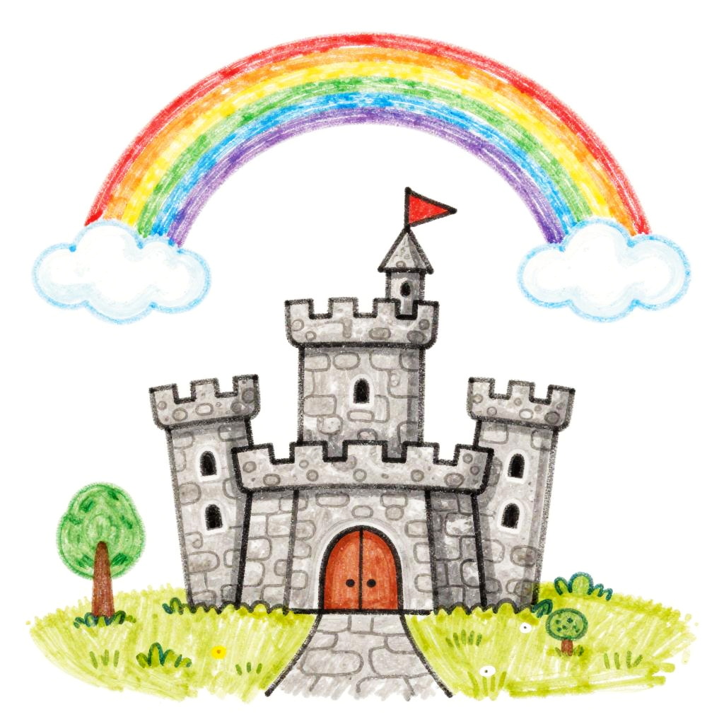 Colorful children's drawing of a castle with blue turrets, rainbow, bunny, sunny sky, wooden fence, and grassy field.