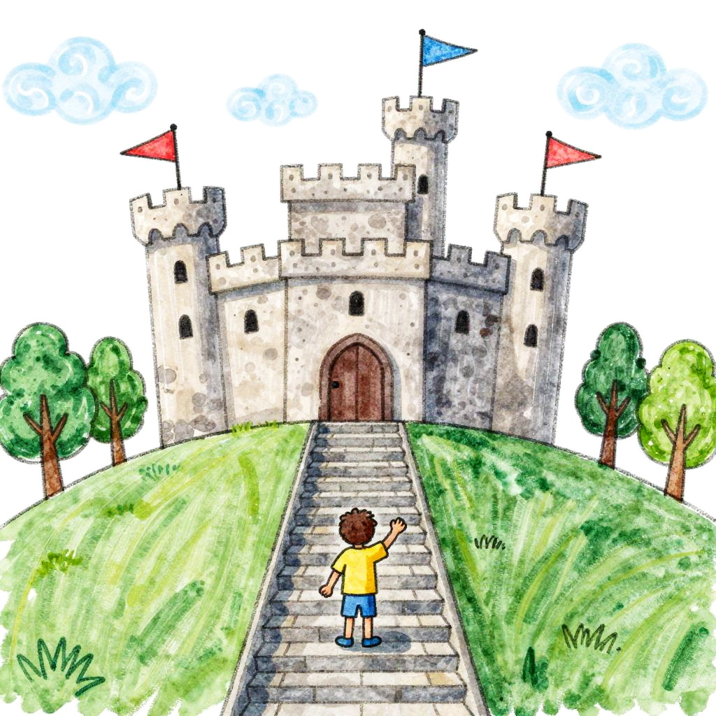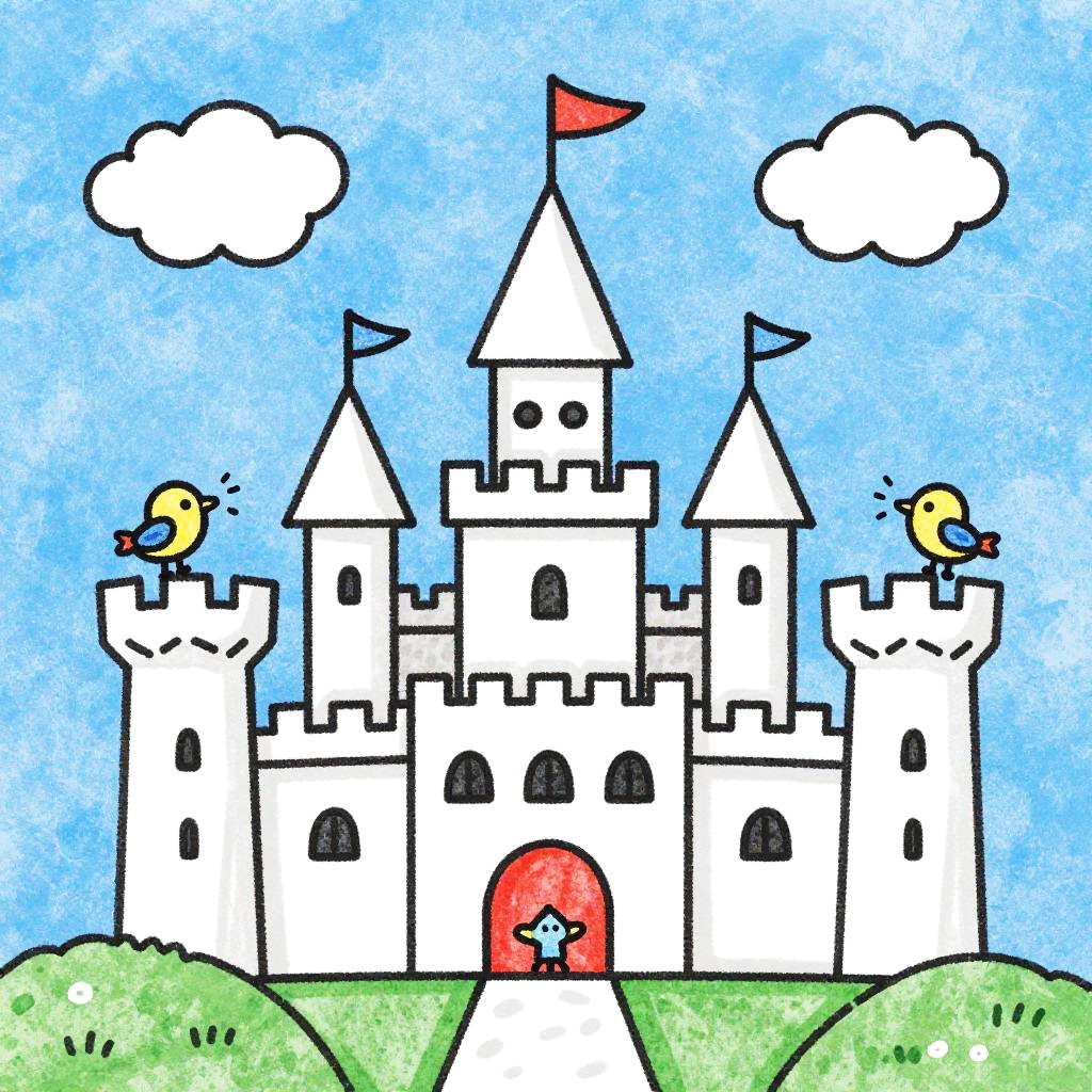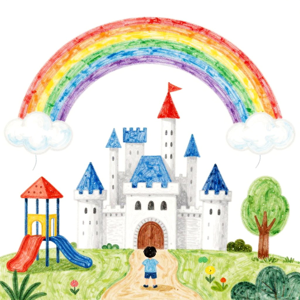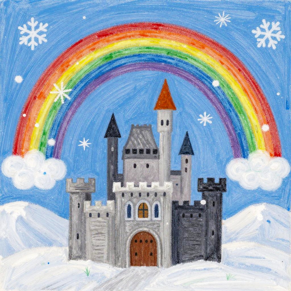 Colorful children's drawing of a castle with blue turrets, rainbow, bunny, sunny sky, wooden fence, and grassy field.