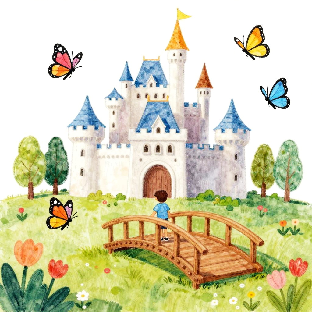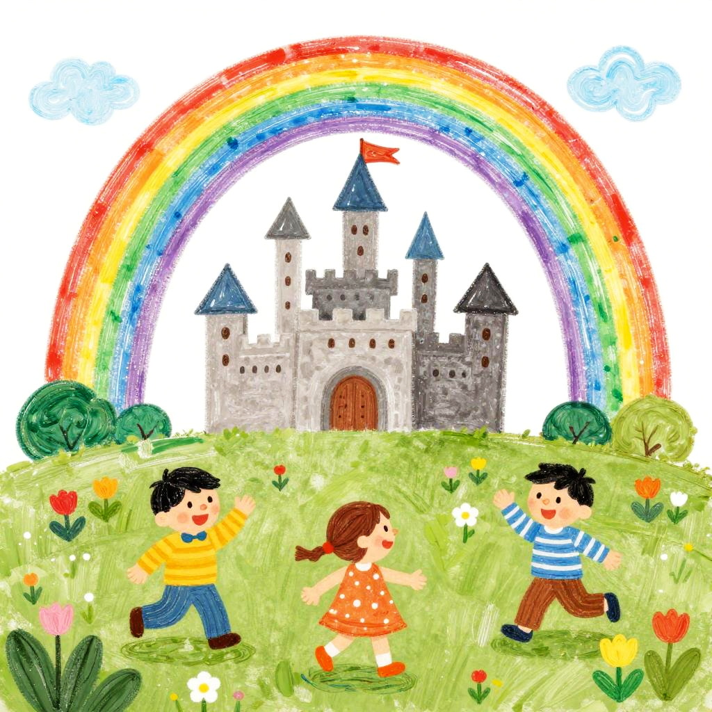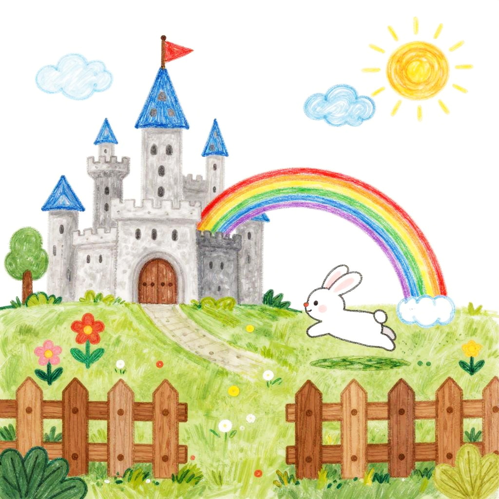 A child's drawing of a castle with a rainbow jumping rabbits fun and playful wooden fence meadow with flowers
