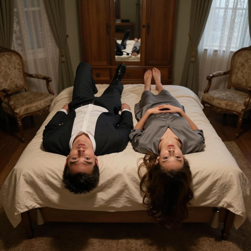 Man and woman lying on a bed in a dimly lit, vintage-style room. Man in dark suit, white shirt, woman in gray blouse. Both face forward, arms extended. Background includes wooden wardrobe, mirror, lace curtains, upholstered chairs. Warm light. Brown carpet. Man on left, woman on right. Intense expressions. Two people.