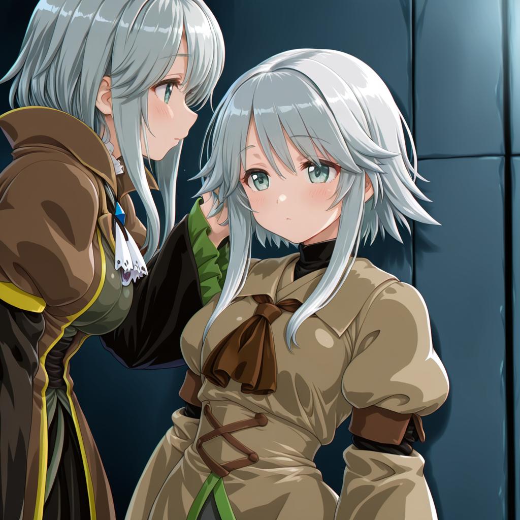 Houlen yabusame, len'en, 1other, grey eyes, grey hair, short hair, short hair with long locks, brown coat, short over long sleeves, puffy short sleeves, wide sleeves, ascot, by artist dd (ijigendd), dark_illustrious