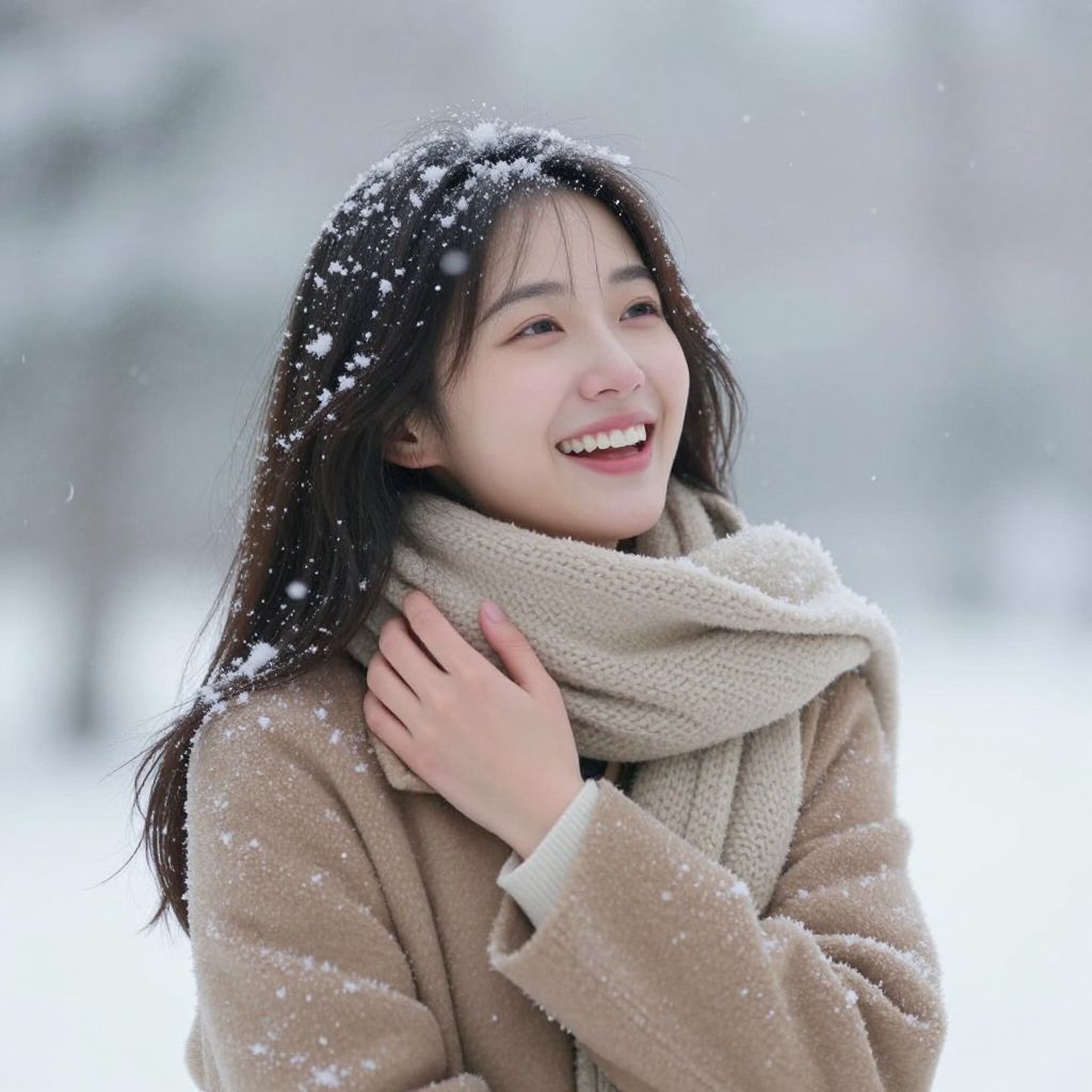 Portrait of a young Asian woman smiling and enjoying falling snow outdoors. She is wearing a beige coat and a thick knitted scarf, with snowflakes lightly covering her hair and clothing. The background is softly blurred, emphasizing the serene snowy winter atmosphere.