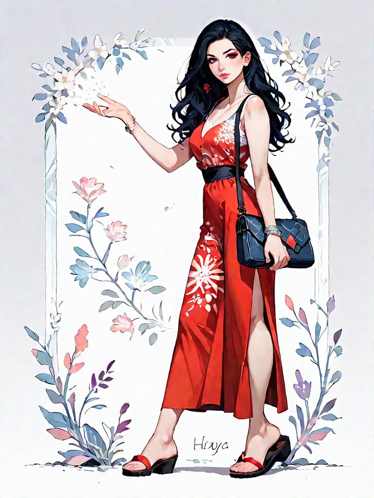 A full-body digital illustration of a young woman with natural wavy black hair wearing a flowy red maxi dress featuring white abstract floral prints, a deep V-neckline, thin spaghetti straps, a high side slit, and uneven hemline. She is accessorized with multiple silver bangle bracelets and holds a small black shoulder bag. The woman is posed with one arm extended and barefoot, standing against a white studio background framed with soft pastel floral designs.