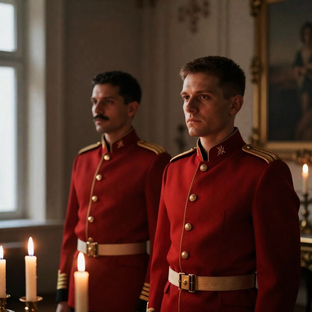 Two men in red military uniforms with gold trim stand in a dimly lit room. Both have serious expressions. The man in the foreground has short brown hair, while the man in the background has dark hair and a mustache. Several white candles with lit flames are in the foreground, slightly to the left. The blurred background features ornate wall art and a window.
