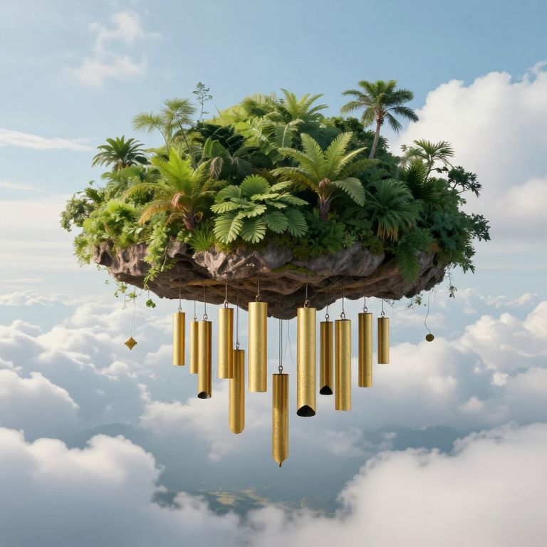 Suspended between earth and sky, a verdant island cradles a symphony of golden chimes, their gentle melodies weaving a celestial lullaby that echoes the whispers of freedom and serenity amidst the ever-shifting clouds.