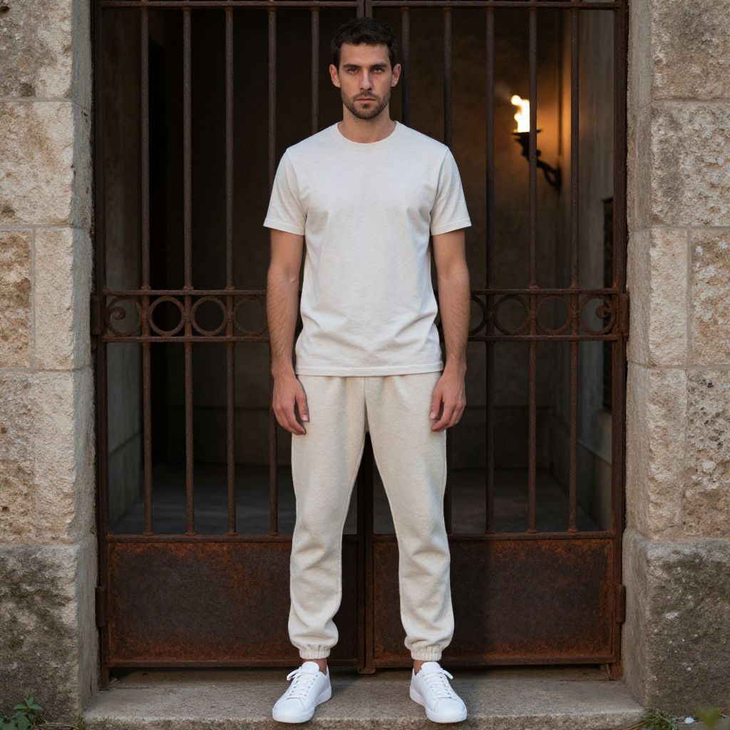 A man, soft cotton relaxed fit tee, matching fleece jogger pants, minimalist white sneakers, stone walls, rusted iron gates, flickering torchlight, pinhole camera style, contemplative expression Man has masculine face and piercing eyes