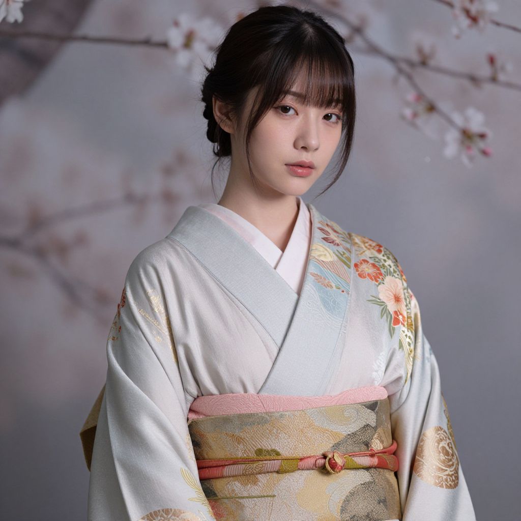 Photograph of a young East Asian woman with fair skin and straight, dark brown hair tied in a loose bun with bangs. She wears a traditional Japanese kimono with a white top and a golden-patterned obi sash with pink accents. The kimono features delicate floral embroidery on the left shoulder. She stands against a softly blurred background of cherry blossom branches, creating a serene, spring-like atmosphere. Her expression is calm and slightly smiling, with minimal makeup highlighting her natural beauty. The overall image has a soft, pastel color palette.