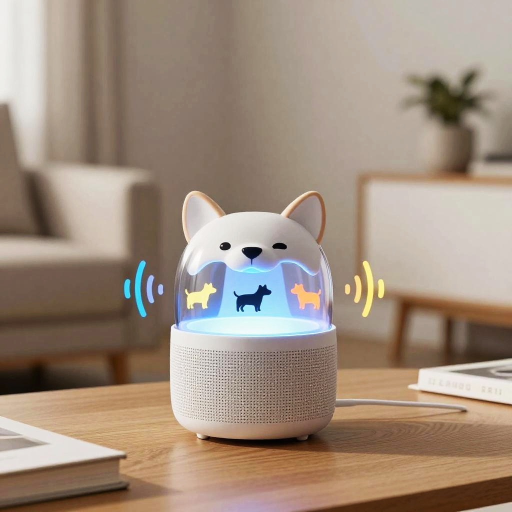 Bark voice AI device designed as a smart speaker with dog ears, emitting colorful voice waves visualized as animated bark symbols, in a modern living room setting, minimalist style, soft warm lighting, emphasizing advanced voice recognition technology.
