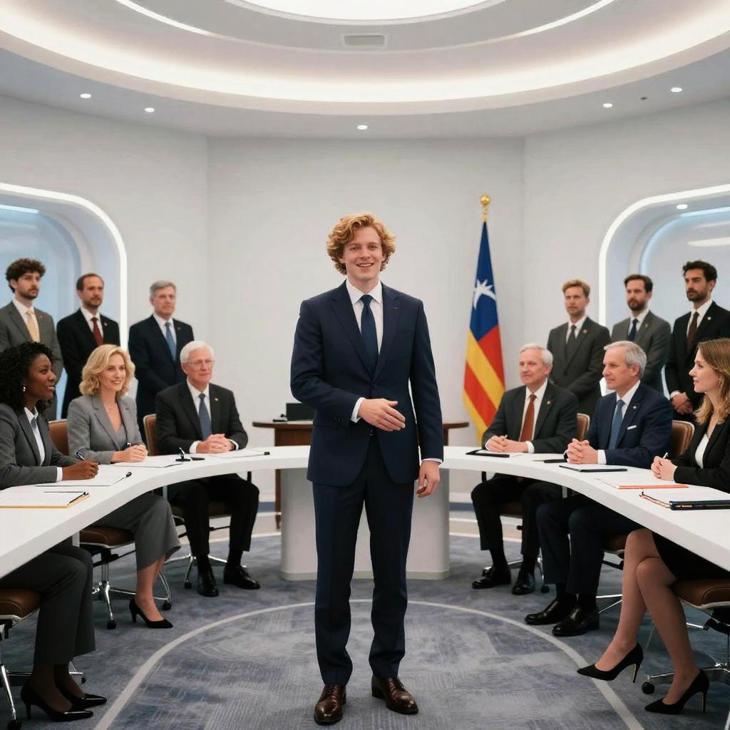 MrBeast president shaking hands with world leaders in a high-tech Oval Office, sleek modern design, powerful and charismatic atmosphere, photorealistic style