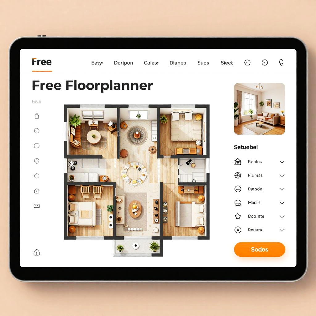 Free floorplanner software screen showing a detailed layout of a cozy apartment, various room configurations with furniture placement, interactive tools visible, vibrant colors, 3D preview window, user-friendly design with modern typography and icons