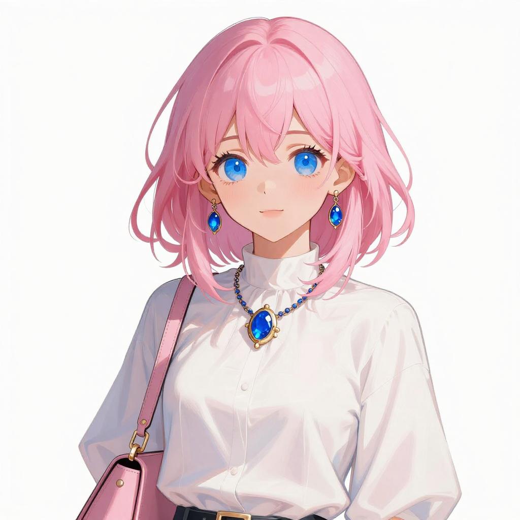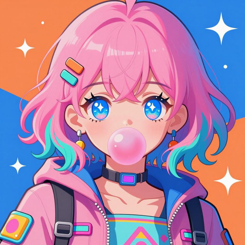 Detailed anime-style close-up portrait of an energetic girl featuring bubblegum pink curls with teal streaks, large expressive blue eyes with sparkling gradient and pixel highlights. She wears a retro sci-fi jacket with bright patches and LED details. The background is a colorful starry mix of orange and blue, with bold outlines and flat color areas enhancing the vibrant neon and pastel palette. The image captures a dynamic and youthful pop art and modern anime fusion atmosphere.