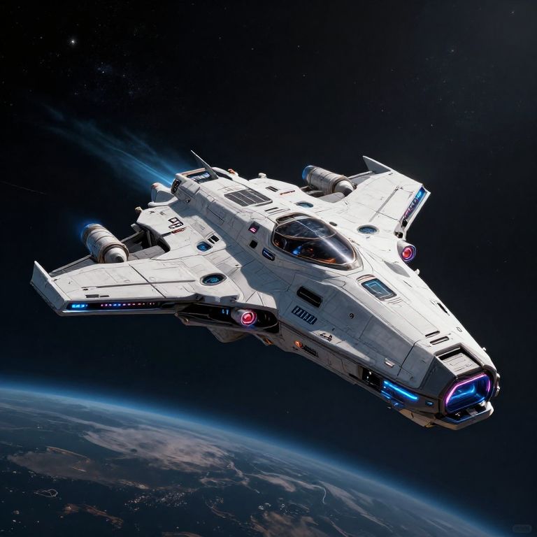 Digital CGI image of a white, futuristic space shuttle with blue lights, flying through dark space above Earth's curved horizon.