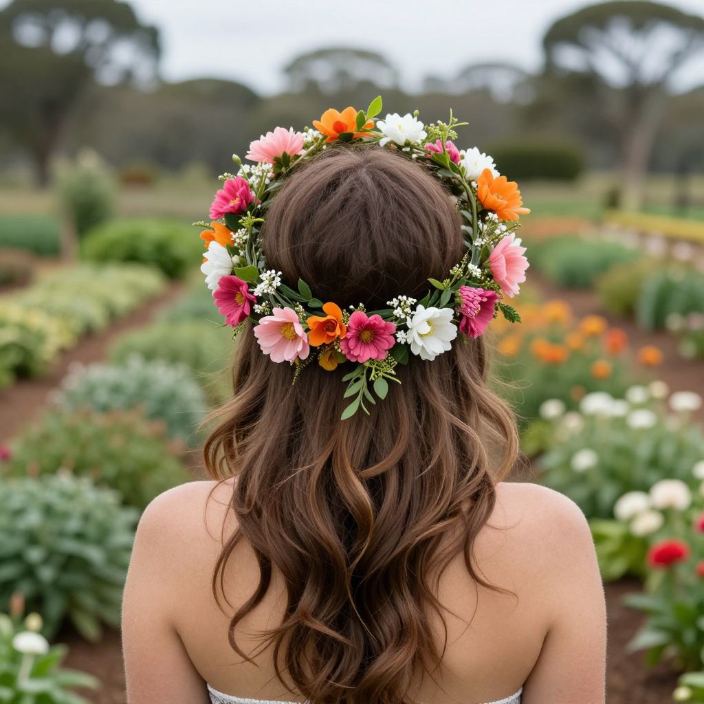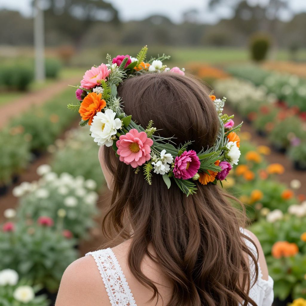 Woman's back view showcasing a vibrant floral crown adorned with pink, orange, and white flowers, complemented by green foliage, as she stands amidst rows of blooming plants in The Outback Farm's serene garden setting.