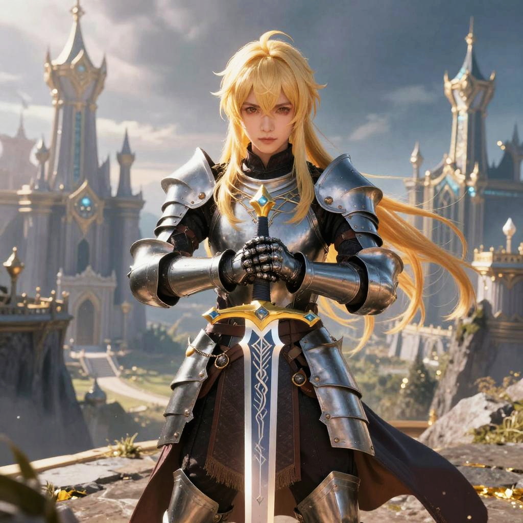 Blonde hair anime character in medieval fantasy attire, armored knight with elegant golden hair cascading down shoulders, holding a gleaming sword with magical runes, standing on a cliff overlooking a vast enchanted kingdom, dramatic lighting, cinematic composition.