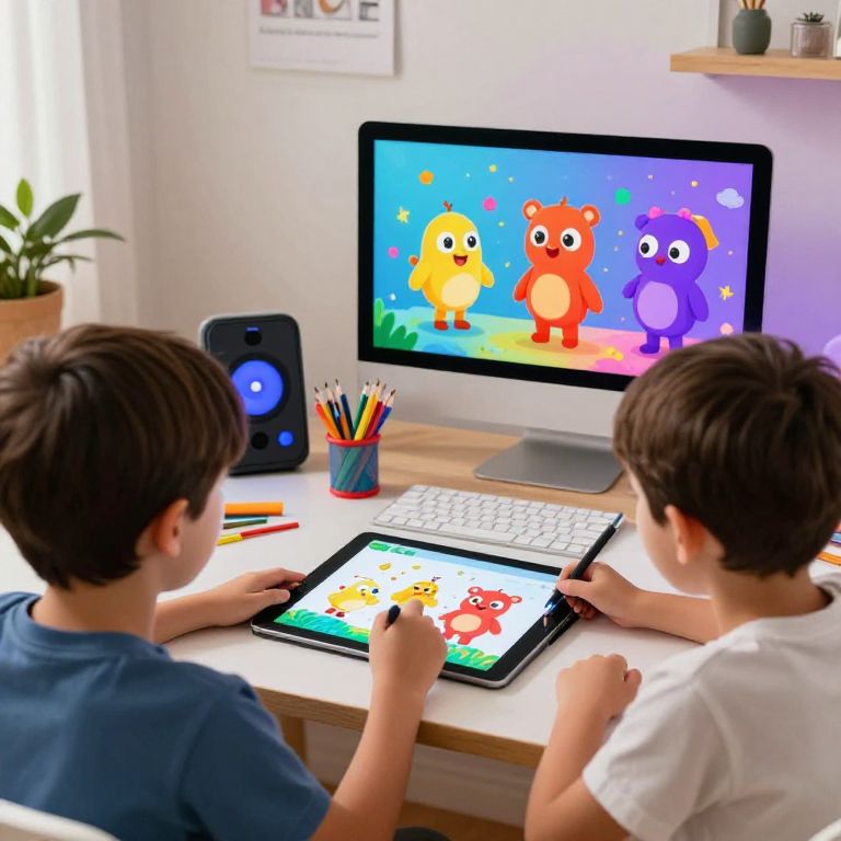 AI prompt kids learning to create digital art with a tablet in a cozy home studio filled with colorful gadgets and animated characters guiding them in real time.
