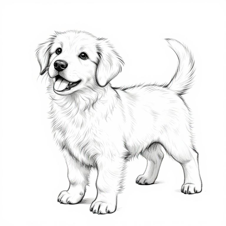 Black and white digital line drawing of a cute, fluffy, white puppy with floppy ears, a wagging tail, and an open mouth with its tongue slightly out. The puppy's fur is detailed with fine, textured lines, giving it a soft appearance. It stands on all four legs, facing slightly to the left. The background is plain white, emphasizing the puppy's joyful expression and fluffy texture. The style is reminiscent of traditional ink illustrations, focusing on clean, precise lines and expressive details.