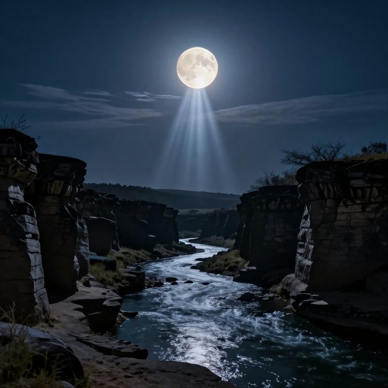 A luminous moon radiates ethereal beams of light that cascade across a darkened landscape, illuminating a tranquil river that flows between ancient stone formations, defying the boundaries of night and creating a surreal realm where celestial energy merges with earthly forms.