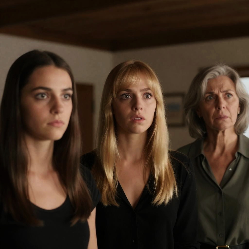 Photograph of three women indoors. Young woman with straight brown hair, serious expression, left. Blonde woman with bangs, surprised expression, center. Older woman with gray hair, concerned expression, right. Wooden ceiling, dim lighting, background objects.
