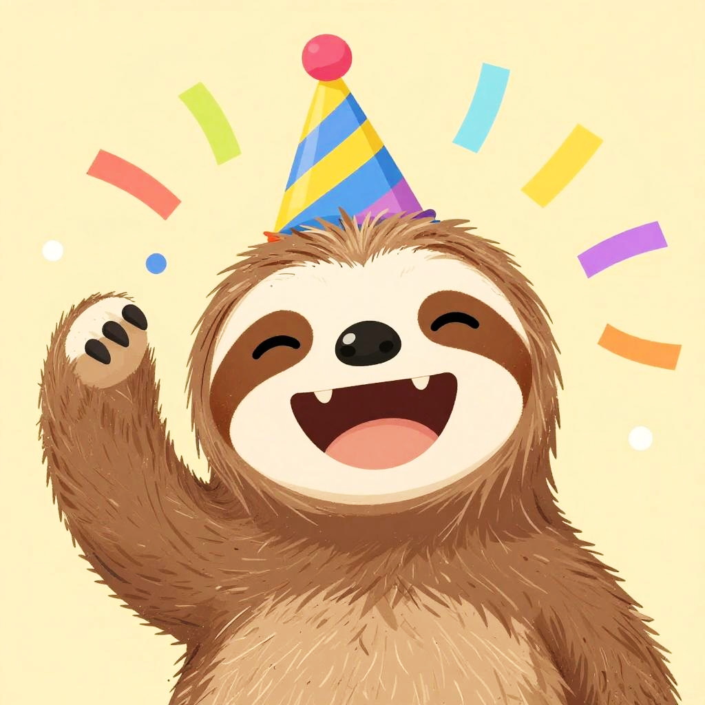 Laughing sloth wearing a colorful party hat, confetti falling around, bright festive background, cartoon style with exaggerated features, playful mood