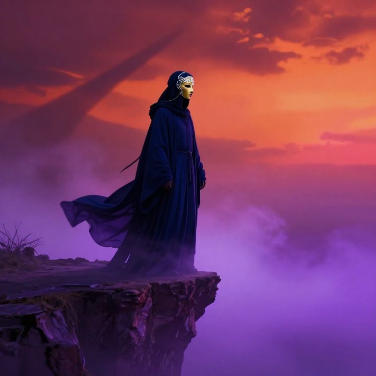 A surreal digital masterpiece depicts an enigmatic figure adorned in flowing midnight blue robes, their face concealed beneath a golden mask embellished with intricate silver filigree patterns. The figure stands on the edge of a precarious precipice overlooking a vast expanse of luminescent purple fog, evoking both awe and trepidation. As the light transitions from deep crimson hues to vibrant oranges and pinks, it casts elongated shadows across the inky sky, creating an otherworldly dreamscape filled with ethereal beauty and an air of impending revelation. This captivating scene invites viewers to explore a range of emotions while questioning the nature of reality through its mesmerizing style and approach.