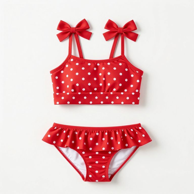 Cute red polka-dot bikini set for infants featuring two halter-style tops with adjustable straps and bows, paired with ruffled swim bottoms, ideal for summer pool, beach, or seaside activities.