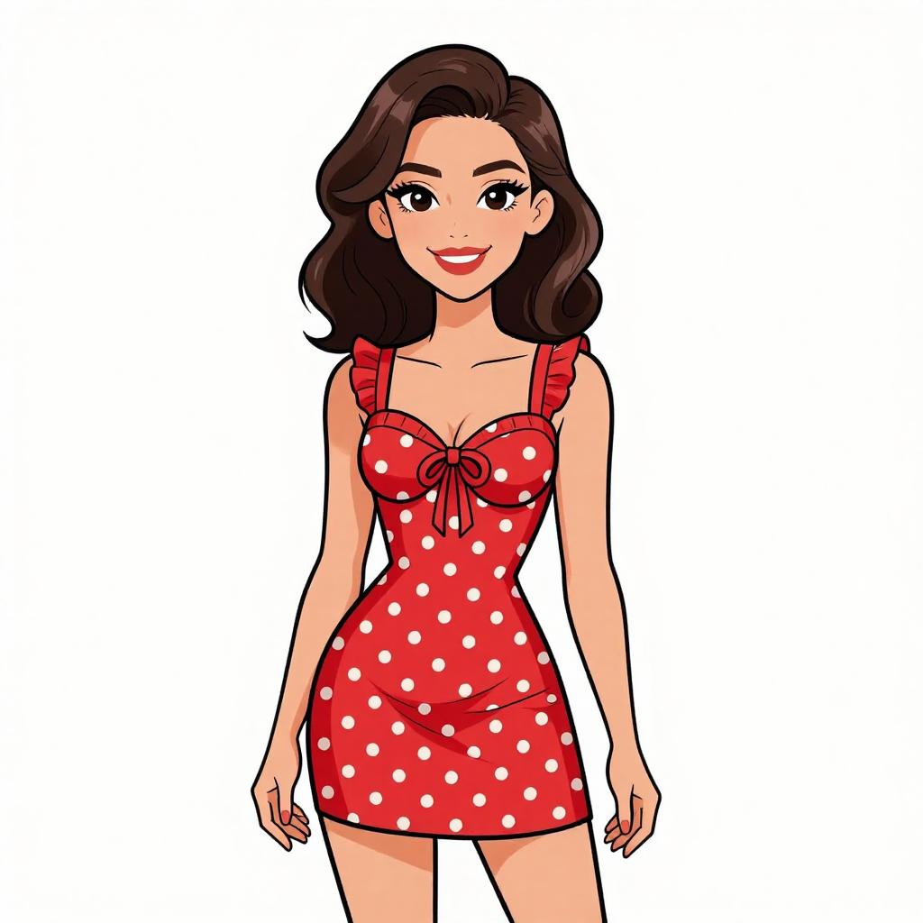 Woman with pretty face and pretty hair. smiling Woman, retro-inspired, red mini dress with white polka dots, sweetheart neckline, thin straps with ruffle detail, fitted bodice with front bow tie, short hemline, plain white background. --sref 1467