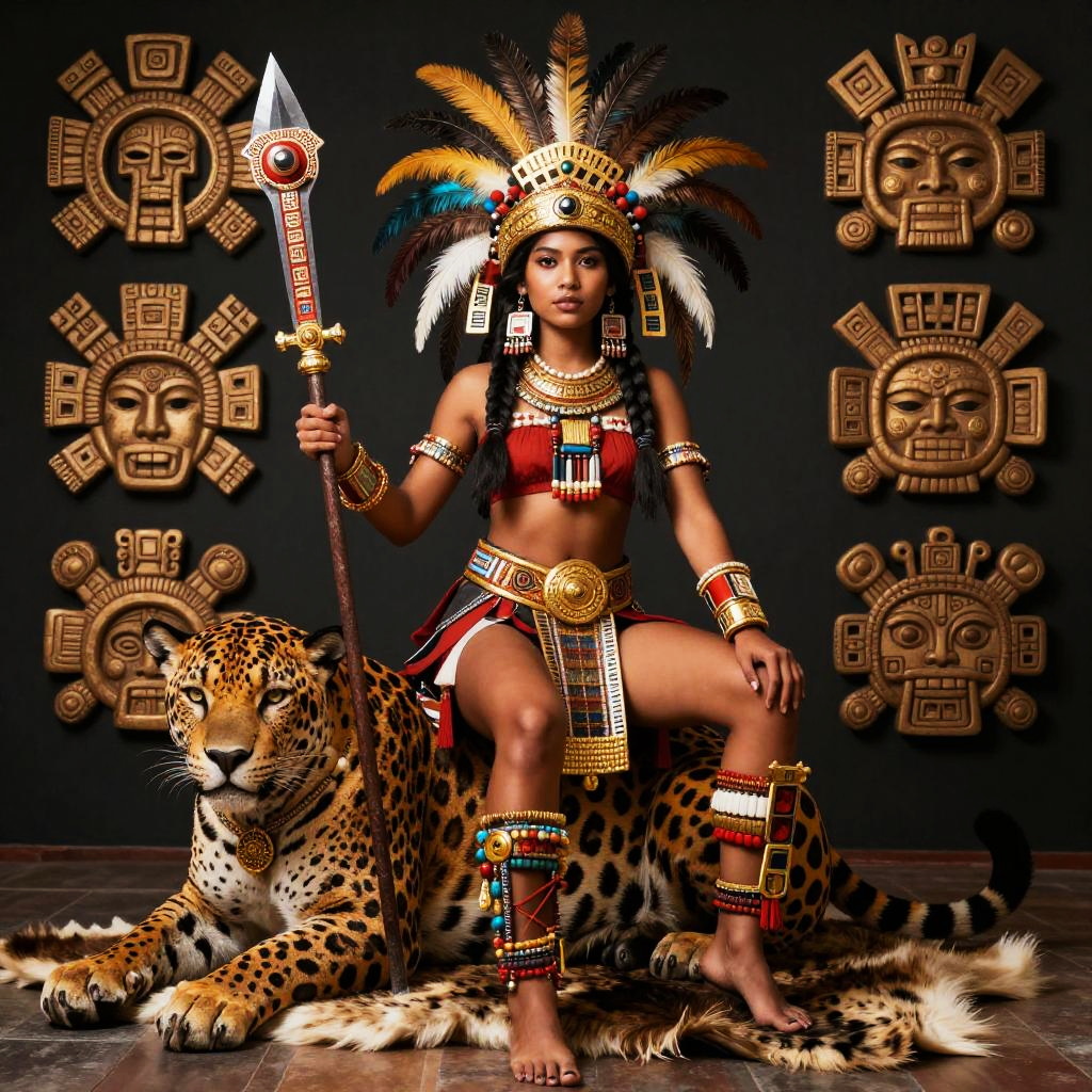 Photograph of a dark-skinned woman with a slender, toned physique, wearing traditional Aztec-style attire. She has a large, ornate feather headdress, red and black patterned top, and gold and turquoise jewelry. She sits confidently on a resting cheetah with her right leg crossed over her left, holding a ceremonial spear. The background features carved wooden sun and moon motifs in gold. The cheetah's fur is detailed with distinct spots. The setting is dramatic with dark lighting, emphasizing the rich colors and textures of the subject's outfit and the cheetah's fur. The overall style is vibrant and culturally rich.