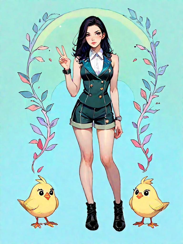 1girl, source_comics, realistic face, full body shot, Woman, chic, sleeveless double-breasted blazer-style romper in olive green, notch lapel, V-neckline, side flap pockets, tailored fit, thigh-length shorts, black minimalist wristwatch.