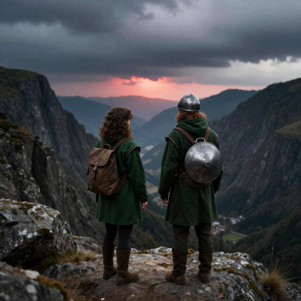 Two people with curly hair, wearing green medieval-style clothing and backpacks, stand on rocky terrain, facing a mountainous landscape. One person has a metal helmet and circular object on their back. Dark, cloudy sky with a red glow in the distance. Rugged, jagged mountains surround them.